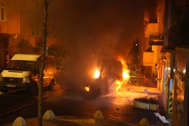 Hemşire ve sürücü ambulansı terk ederken, alevlerin sardığı aracın freni boşaldı ve yokuş aşağı hareket etti. Park halindeki araçlara ve elektrik direğine çarpan ambulansta patlamalar meydana geldi.