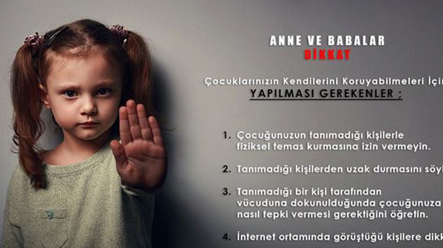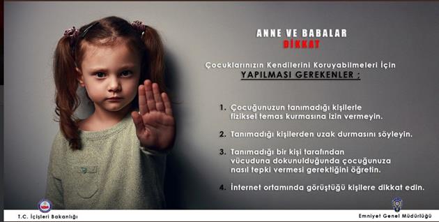 Türk Polis Teşkilatı resmi sosyal medya hesabından yapılan paylaşımda, ailelere çocuğun tanımadığı kişilerle fiziksel temas kurmasına izin verilmemesi, çocuğun tanımadığı kişilerden uzak durması, tanımadığı bir kişi tarafından vücuduna dokunulduğunda nasıl tepki vermesinin öğretilmesi gerektiği bildirildi.