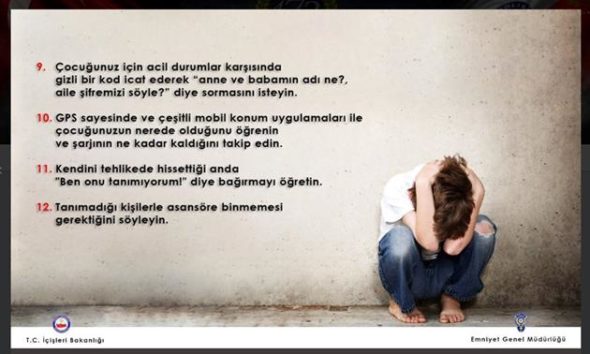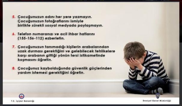 “Çocuğunuzun adını her yere yazmayın. Çocuğunuzun fotoğraflarını ismiyle birlikte sürekli sosyal medyada paylaşmayın. Telefon numaranızı ve acil ihbar hatlarını (155-156-112) ezberletin. Çocuğunuzun tanımadığı kişilerin arabalarından uzak durması gerektiğini ve gelebilecek tehlikelere karşı arabanın gittiği yönün tersi istikametinde koşmasını öğretin. Çocuğunuz kaybolduğunda güvenlik güçlerinden yardım istemesi gerektiğini öğretin. Çocuğunuz için acil durumlar karşısında gizli bir kod icat ederek ‘anne ve babamın adı ne? Aile şifremizi söyle?’ diye sormasını isteyin. GPS sayesinde ve çeşitli mobil konum uygulamaları ile çocuğunuzun nerede olduğunu öğrenin ve şarjının ne kadar kaldığını takip edin. Kendini tehlikede hissettiği anda ‘Ben onu tanımıyorum!’ diye bağırmayı öğretin. Tanımadığı kişilerle asansöre binmemesi gerektiğini söyleyin.”