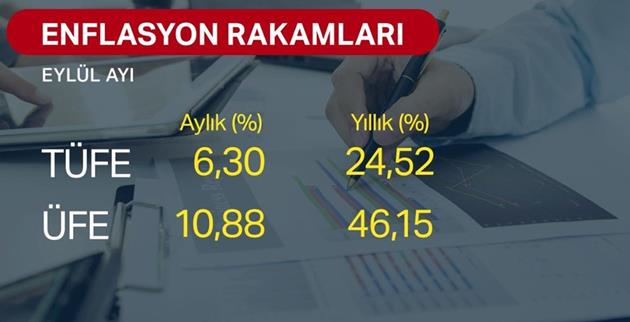 Türkiye İstatistik Kurumu eylül ayı enflasyon rakamlarını açıkladı. Enflasyon, eylül ayında yıllık yüzde 24,52 aylık yüzde 6,3 oldu.