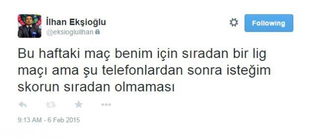 İlhan Ekşioğlu söz konusu tweetinde “Bu haftaki maç benim için sıradan bir lig maçı ama şu telefonlardan sonra isteğim skorun sıradan olmaması” ifadelerini kullandı.