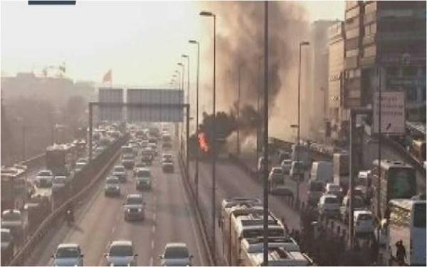 Metrobüs, soğutma çalışmalarının ardından iş makinesiyle çekildi.