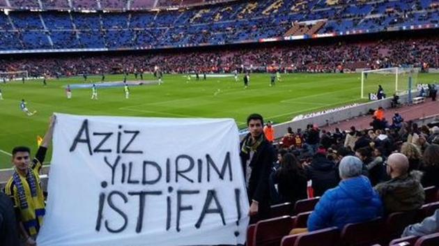 Bir grup Fenerbahçe taraftarı ile Başkan Aziz Yıldırım arasındaki gerilim ilginç bir boyut kazandı. Barcelona’nın bugün Espanyol’u 5-1 yendiği maçta Camp Nou tribünlerinde bulunan Fenerbahçeli taraftarlar, açtıkları pankartla Aziz Yıldırım’ı istifaya davet etti.