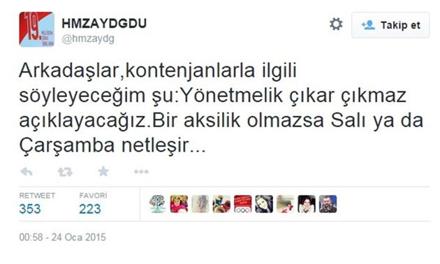 Aydoğdu, mesajında “Arkadaşlar, kontenjanlarla ilgili söyleyeceğim şu: Yönetmelik çıkar çıkmaz açıklayacağız. Bir aksilik olmazsa salı ya da çarşamba netleşir” ifadelerini kullandı.