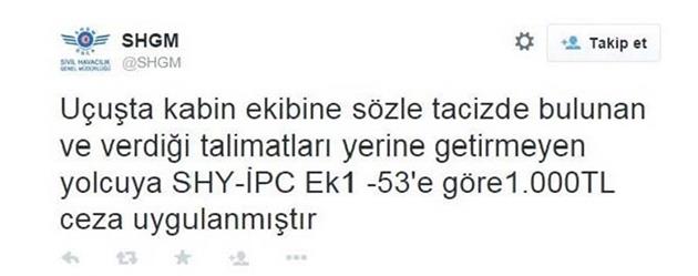 uçakSHGM’nin Twitter hesabından konuyla ilgili yapılan açıklamasında ”Uçuşta kabin ekibine sözle tacizde bulunan ve verdiği talimatları yerine getirmeyen yolcuya SHY-İPC Ek1 -53’e göre 1.000 TL ceza uygulanmıştır” denildi.